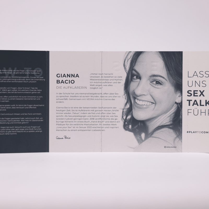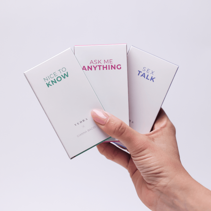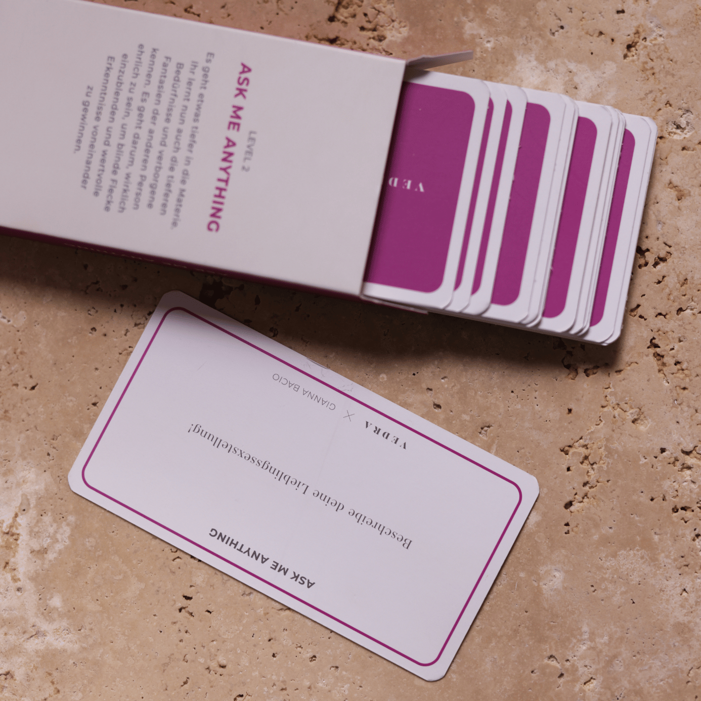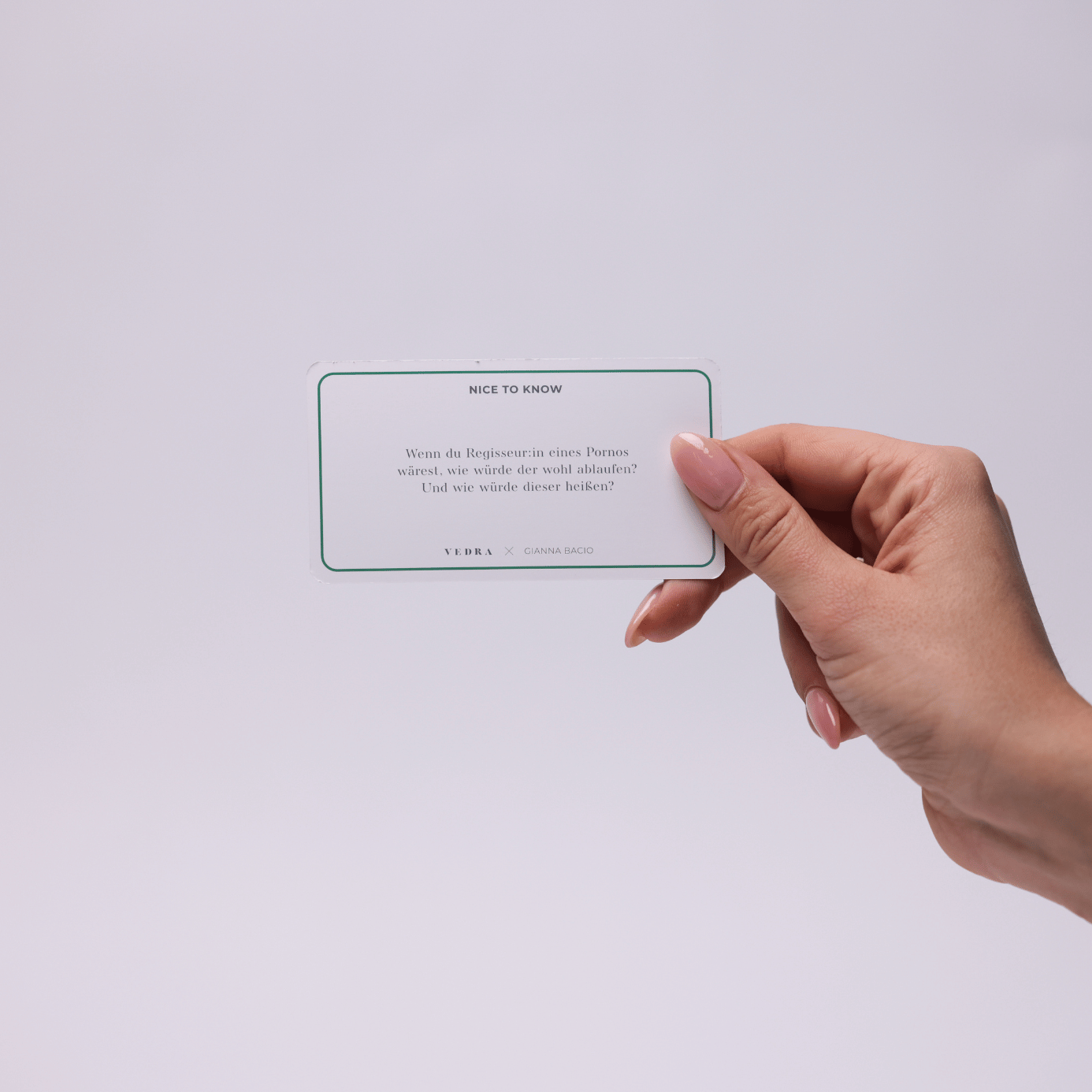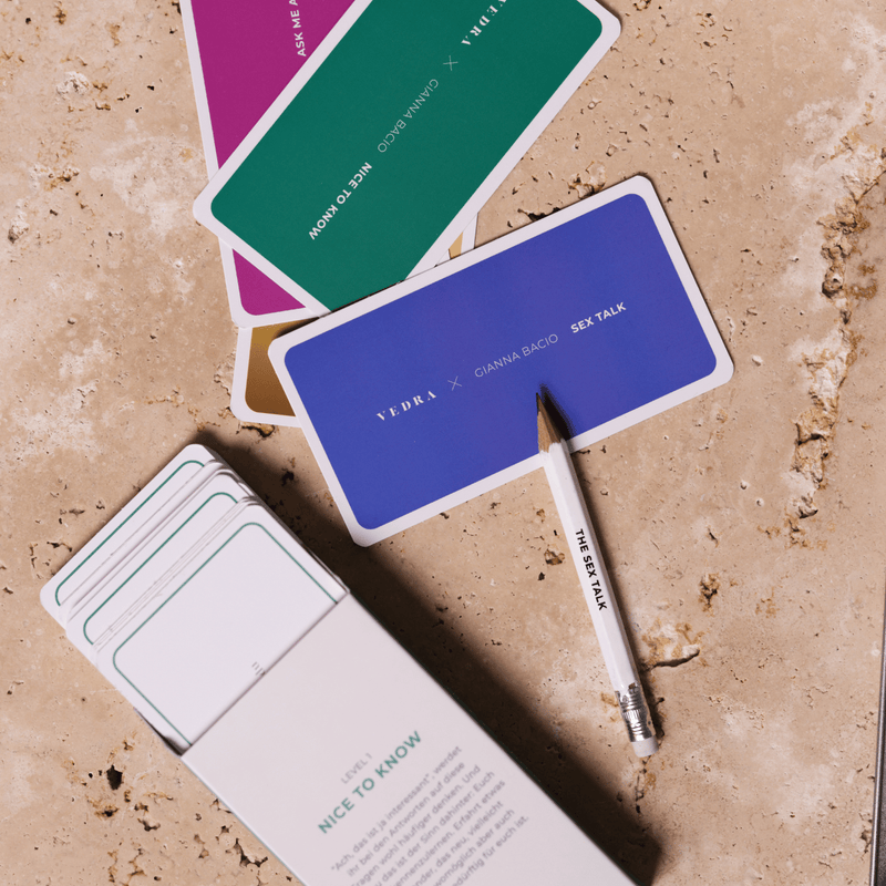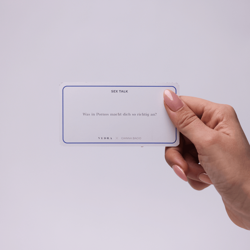 THE SEX TALK ist das perfekte Gadget, um euch kommunikativ auf einem neuen Level zu begegnen. Für ehrliche, echte Gespräche, die unter die Haut gehen: Denn beim Austausch über persönliche Erfahrungen, Werte, Wünsche und (sexuelle) Bedürfnisse kommt ihr euch näher denn je. Das Kartenspiel besteht aus insgesamt 99 Fragen und Aufforderungen, die mit viel Sorgfalt und Know-How von VEDRA und Sexfluencerin Gianna Bacio entwickelt und ausgewählt wurden – in 3 verschiedene Intimitätsstufen gegliedert, von locker bis intensiv. Damit noch nicht genug, enthält THE SEX TALK zusätzlich 15 Special Cards von Gianna Bacio mit Wissen und Sex Facts, die ihr garantiert noch nicht kanntet.