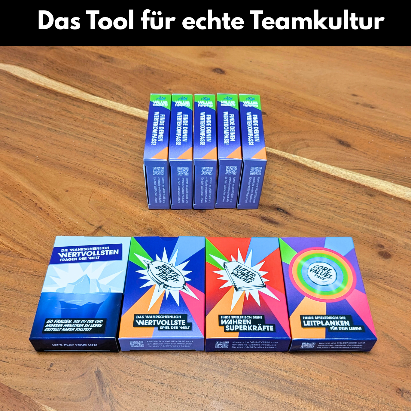 Teamwerte ist ein Workshop-Set aus vier Kartenspielen, die Menschen und Gruppen helfen, ihre inneren und gemeinsamen Werte zu entdecken – spielerisch, leicht und tief.