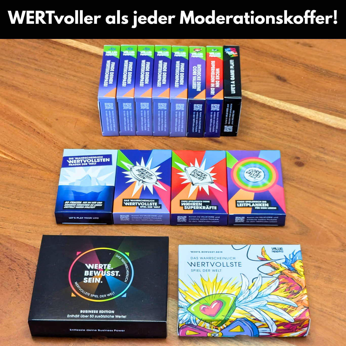 10x Das Basis Spiel – Dieses Spiel ist dein Einstieg in die Welt der Werte. Es ermöglicht dir und deinen Klienten, auf spielerische Weise persönliche Werte zu entdecken und zu reflektieren. Ideal für Einzelsitzungen, Paar-Coachings oder Team-Workshops.